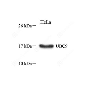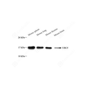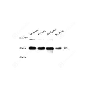 UBC9 is also named as UBE2I, UBCE9 and belongs to the ubiquitin-conjugating enzyme family. It is a homologue of the E2 ubiquitin conjugating enzyme and participates in the covalent linking of SUMO-1 molecule to the target protein. This protein is present at a high level in spleen and lung. Moderate level of UBC9 is detected in kidney and liver. Low amount of UBC9 is observed in brain, whereas the 18 kDa band of UBC9 is barely visible or absent in heart and skeletal muscle. In heart and muscle extracts the UBC9 antibodies recognizes a 38 kDa protein band,but this band is not visible in extracts of other rat tissues.