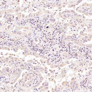 IHC检测UBE2I/UBC9蛋白(货号 GB111874). 样品: 人肺癌, 4%多聚甲醛 (货号G1101) 固定12-24小时. 抗原修复: 柠檬酸抗原修复液(干粉, pH 6.0) (G1201), 98℃, 20分钟. —抗: 1: 1500稀释, 4℃ 孵育过夜. 二抗: HRP标记山羊抗兔IgG (H+L) (货号GB23303), 1: 200稀释, 室温孵育1小时. |