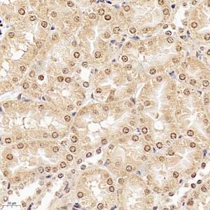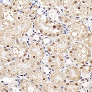IHC检测UBE3A蛋白(货号 GB112462). 样品: 小鼠肾, 4%多聚甲醛 (货号G1101) 固定12-24小时. 抗原修复: 柠檬酸抗原修复液(干粉, pH 6.0) (G1201), 98℃, 20分钟. —抗: 1: 500稀释, 4℃ 孵育过夜. 二抗: HRP标记山羊抗兔IgG (H+L) (货号GB23303), 1: 200稀释, 室温孵育1小时. |