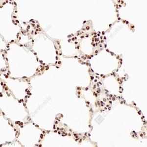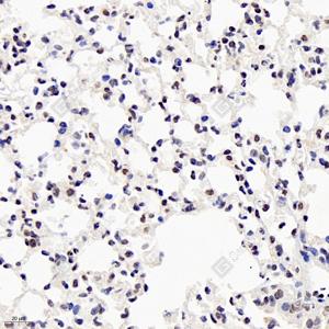 IHC检测UBE3A蛋白(货号 GB112462). 样品: 小鼠肺, 4%多聚甲醛 (货号G1101) 固定12-24小时. 抗原修复: 柠檬酸抗原修复液(干粉, pH 6.0) (G1201), 98℃, 20分钟. —抗: 1: 500稀释, 4℃ 孵育过夜. 二抗: HRP标记山羊抗兔IgG (H+L) (货号GB23303), 1: 200稀释, 室温孵育1小时. |