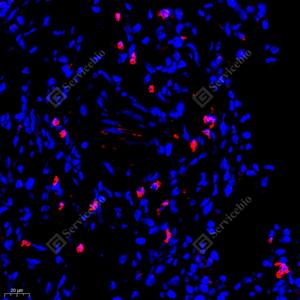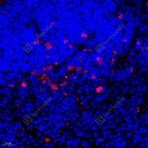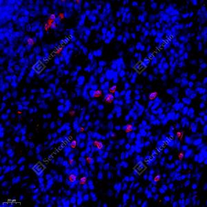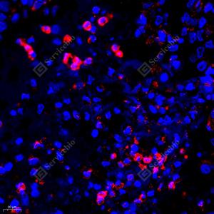 IF检测UBE3A蛋白(货号 GB112462)(红色). 样品: 大鼠脾, 4%多聚甲醛 (货号G1101) 固定12-24小时. 抗原修复: Tris-EDTA抗原修复液(pH 9.0) (G1203), 98℃, 20分钟. 封闭: 3% BSA(货号GC305010)的PBS溶液, 室温孵育30分钟. —抗: 1: 650稀释, 4℃ 孵育过夜. 二抗: Cy3标记山羊抗兔IgG (H+L) (货号GB21303), 1: 300稀释, 室温孵育1小时. |