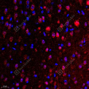 IF检测UBE3A蛋白(货号 GB112462)(红色). 样品: 小鼠脑, 4%多聚甲醛 (货号G1101) 固定12-24小时. 抗原修复: Tris-EDTA抗原修复液(pH 9.0) (G1203), 98℃, 20分钟. 封闭: 3% BSA(货号GC305010)的PBS溶液, 室温孵育30分钟. —抗: 1: 650稀释, 4℃ 孵育过夜. 二抗: Cy3标记山羊抗兔IgG (H+L) (货号GB21303), 1: 300稀释, 室温孵育1小时. |