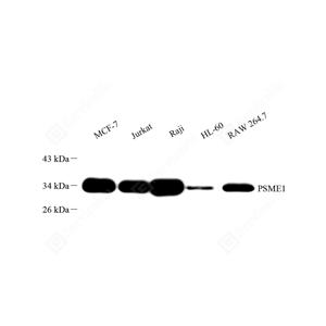 WB检测PSME1蛋白(货号 GB113904). 样品: 经RIPA裂解液(货号G2002)处理的蛋白质. 封闭: 封闭: 3%脱脂牛奶(货号GC310001)溶于TBST溶液, 室温孵育1小时. —抗: 1: 1000稀释, 4℃ 孵育过夜. 二抗: HRP标记山羊抗兔IgG (H+L) (货号GB23303), 1: 5000稀释, 室温孵育1小时. |