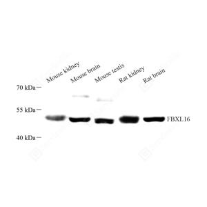 WB检测FBXL16蛋白(货号 GB115243). 样品: 经RIPA裂解液(货号G2002)处理的蛋白质. 封闭: 封闭: 3%脱脂牛奶(货号GC310001)溶于TBST溶液, 室温孵育1小时. —抗: 1: 1000稀释, 4℃ 孵育过夜. 二抗: HRP标记山羊抗兔IgG (H+L) (货号GB23303), 1: 5000稀释, 室温孵育1小时. |