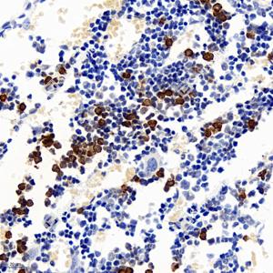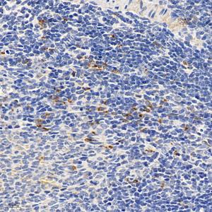 IHC检测Ribonuclease 3/ECP蛋白(货号 GB112150). 样品: 小鼠脾, 4%多聚甲醛 (货号G1101) 固定12-24小时. 抗原修复: 柠檬酸抗原修复液(干粉, pH 6.0) (G1201), 98℃, 20分钟. —抗: 1: 2000稀释, 4℃ 孵育过夜. 二抗: HRP标记山羊抗兔IgG (H+L) (货号GB23303), 1: 200稀释, 室温孵育1小时. |