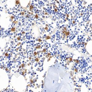 IHC检测Ribonuclease 3/ECP蛋白(货号 GB112150). 样品: 小鼠骨, 4%多聚甲醛 (货号G1101) 固定12-24小时. 抗原修复: 柠檬酸抗原修复液(干粉, pH 6.0) (G1201), 98℃, 20分钟. —抗: 1: 2000稀释, 4℃ 孵育过夜. 二抗: HRP标记山羊抗兔IgG (H+L) (货号GB23303), 1: 200稀释, 室温孵育1小时. |