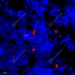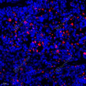IF检测Ribonuclease 3/ECP蛋白(货号 GB112150)(红色). 样品: 小鼠脾, 4%多聚甲醛 (货号G1101) 固定12-24小时. 抗原修复: Tris-EDTA抗原修复液(pH 9.0) (G1203), 98℃, 20分钟. 封闭: 3% BSA(货号GC305010)的PBS溶液, 室温孵育30分钟. —抗: 1: 1000稀释, 4℃ 孵育过夜. 二抗: Cy3标记山羊抗兔IgG (H+L) (货号GB21303), 1: 300稀释, 室温孵育1小时. |