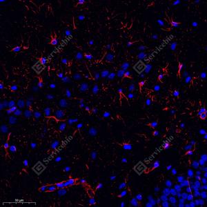 IF检测Ribonuclease 3/ECP蛋白(货号 GB112150)(红色). 样品: 大鼠脑, 4%多聚甲醛 (货号G1101) 固定12-24小时. 抗原修复: Tris-EDTA抗原修复液(pH 9.0) (G1203), 98℃, 20分钟. 封闭: 3% BSA(货号GC305010)的PBS溶液, 室温孵育30分钟. —抗: 1: 1000稀释, 4℃ 孵育过夜. 二抗: Cy3标记山羊抗兔IgG (H+L) (货号GB21303), 1: 300稀释, 室温孵育1小时. |