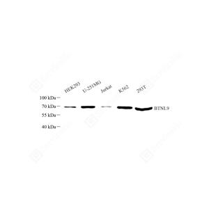 WB检测BTNL9蛋白(货号 GB113947). 样品: 经RIPA裂解液(货号G2002)处理的蛋白质. 封闭: 封闭: 3%脱脂牛奶(货号GC310001)溶于TBST溶液, 室温孵育1小时. —抗: 1: 1000稀释, 4℃ 孵育过夜. 二抗: HRP标记山羊抗兔IgG (H+L) (货号GB23303), 1: 5000稀释, 室温孵育1小时. |