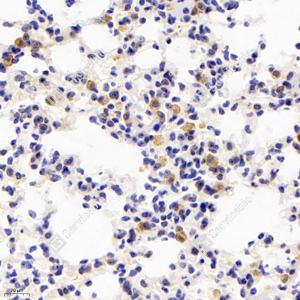 IHC检测FCN1/M-Ficolin蛋白(货号 GB113616). 样品: 小鼠肺, 4%多聚甲醛 (货号G1101) 固定12-24小时. 抗原修复: 柠檬酸抗原修复液(干粉, pH 6.0) (G1201), 98℃, 20分钟. —抗: 1: 2400稀释, 4℃ 孵育过夜. 二抗: HRP标记山羊抗兔IgG (H+L) (货号GB23303), 1: 200稀释, 室温孵育1小时. |