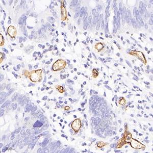 IHC检测CD34蛋白(货号 GB151693). 样品: 人结直肠癌, 4%多聚甲醛 (货号G1101) 固定12-24小时. 抗原修复: 柠檬酸抗原修复液(干粉, pH 6.0) (G1201), 高压锅均匀喷气计时2分钟. —抗: 1: 500稀释, 4℃ 孵育过夜. 二抗: HRP标记山羊抗小鼠IgG (H+L) (货号GB23301), 1: 200稀释, 室温孵育1小时. |