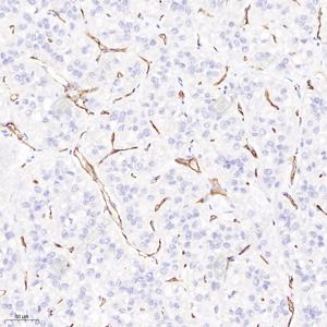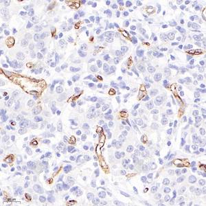IHC检测CD34蛋白(货号 GB151693). 样品: 人肝癌, 4%多聚甲醛 (货号G1101) 固定12-24小时. 抗原修复: 柠檬酸抗原修复液(干粉, pH 6.0) (G1201), 高压锅均匀喷气计时2分钟. —抗: 1: 500稀释, 4℃ 孵育过夜. 二抗: HRP标记山羊抗小鼠IgG (H+L) (货号GB23301), 1: 200稀释, 室温孵育1小时. |