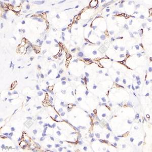 IHC检测CD34蛋白(货号 GB151693). 样品: 人肾癌, 4%多聚甲醛 (货号G1101) 固定12-24小时. 抗原修复: 柠檬酸抗原修复液(干粉, pH 6.0) (G1201), 高压锅均匀喷气计时2分钟. —抗: 1: 500稀释, 4℃ 孵育过夜. 二抗: HRP标记山羊抗小鼠IgG (H+L) (货号GB23301), 1: 200稀释, 室温孵育1小时. |