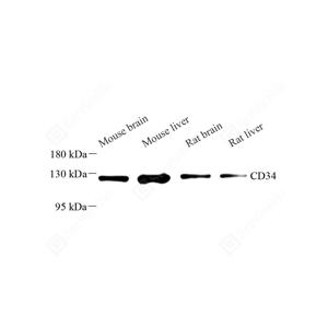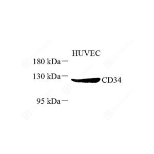 WB检测CD34蛋白(货号 GB111693). 样品: 经RIPA裂解液(货号G2002)处理的蛋白质. 封闭: 3%脱脂牛奶(货号GC310001)溶于TBST溶液, 室温孵育1小时. —抗: 1: 1000稀释, 4℃ 孵育过夜. 二抗: HRP标记山羊抗兔IgG (H+L) (货号GB23303), 1: 5000稀释, 室温孵育1小时. |