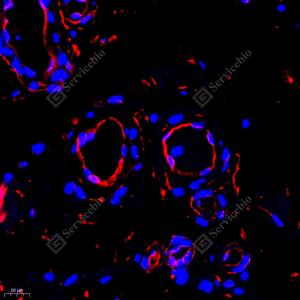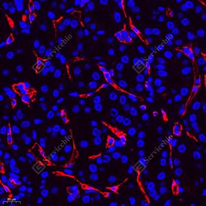 IF检测CD34蛋白(货号 GB111693)(红色). 样品: 人肾, 4%多聚甲醛 (货号G1101) 固定12-24小时. 抗原修复: Tris-EDTA抗原修复液(pH 9.0) (G1203), 98℃, 20分钟. 封闭: 3% BSA(货号GC305010)的PBS溶液, 室温孵育30分钟. —抗: 1: 600稀释, 4℃ 孵育过夜. 二抗: Cy3标记山羊抗兔IgG (H+L) (货号GB21303), 1: 300稀释, 室温孵育1小时. |