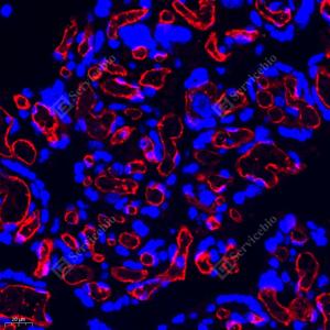 IF检测CD34蛋白(货号 GB111693)(红色). 样品: 人胎盘, 4%多聚甲醛 (货号G1101) 固定12-24小时. 抗原修复: Tris-EDTA抗原修复液(pH 9.0) (G1203), 98℃, 20分钟. 封闭: 3% BSA(货号GC305010)的PBS溶液, 室温孵育30分钟. —抗: 1: 600稀释, 4℃ 孵育过夜. 二抗: Cy3标记山羊抗兔IgG (H+L) (货号GB21303), 1: 300稀释, 室温孵育1小时. |