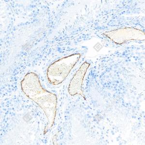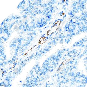 | IHC检测Von Willebrand Factor蛋白(货号 GB120019). 样品: 人子宫内膜癌, 4%多聚甲醛 (货号G1101) 固定12-24小时. 抗原修复: 柠檬酸抗原修复液(干粉, pH 6.0) (G1201), 高压锅均匀喷气计时2分钟. —抗: 1: 1000稀释, 4℃ 孵育过夜. 二抗: S-vision免疫组化多聚二抗(山羊抗小鼠), 即用型(货号G1301), 室温孵育20分钟. |