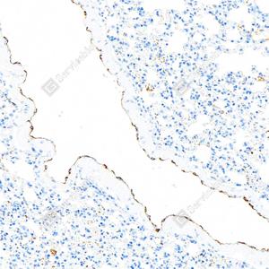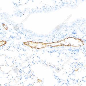 | IHC检测Von Willebrand Factor蛋白(货号 GB120019). 样品: 小鼠肺, 4%多聚甲醛 (货号G1101) 固定12-24小时. 抗原修复: 柠檬酸抗原修复液(干粉, pH 6.0) (G1201), 高压锅均匀喷气计时2分钟. —抗: 1: 1000稀释, 4℃ 孵育过夜. 二抗: S-vision免疫组化多聚二抗(山羊抗小鼠), 即用型(货号G1301), 室温孵育20分钟. |