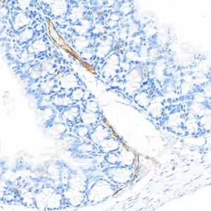 | IHC检测Von Willebrand Factor蛋白(货号 GB120019). 样品: 大鼠结肠, 4%多聚甲醛 (货号G1101) 固定12-24小时. 抗原修复: 柠檬酸抗原修复液(干粉, pH 6.0) (G1201), 高压锅均匀喷气计时2分钟. —抗: 1: 1000稀释, 4℃ 孵育过夜. 二抗: S-vision免疫组化多聚二抗(山羊抗小鼠), 即用型(货号G1301), 室温孵育20分钟. |