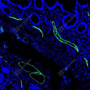 | IF检测Von Willebrand Factor蛋白(货号 GB120019)(绿色). 样品: 人结肠, 4%多聚甲醛 (货号G1101) 固定12-24小时. 抗原修复: 柠檬酸抗原修复液(干粉, pH 6.0) (G1201), 高压锅均匀喷气计时2分钟. 封闭: 3% BSA(货号GC305010)的PBS溶液, 室温孵育30分钟. —抗: 1: 1000稀释, 4℃ 孵育过夜. 二抗: Alexa Fluor 488标记山羊抗小鼠IgG (H+L) (货号GB25301), 1: 400稀释, 室温孵育1小时. |