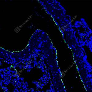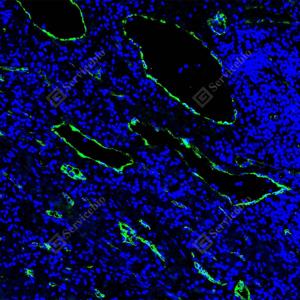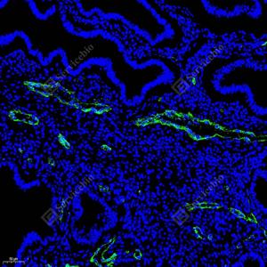 | IF检测Von Willebrand Factor蛋白(货号 GB120019)(绿色). 样品: 小鼠肺, 4%多聚甲醛 (货号G1101) 固定12-24小时. 抗原修复: 柠檬酸抗原修复液(干粉, pH 6.0) (G1201), 高压锅均匀喷气计时2分钟. 封闭: 3% BSA(货号GC305010)的PBS溶液, 室温孵育30分钟. —抗: 1: 1000稀释, 4℃ 孵育过夜. 二抗: Alexa Fluor 488标记山羊抗小鼠IgG (H+L) (货号GB25301), 1: 400稀释, 室温孵育1小时. |
