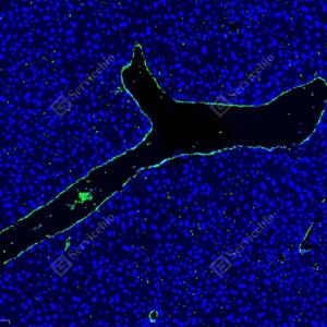 | IF检测Von Willebrand Factor蛋白(货号 GB120019)(绿色). 样品: 小鼠肝, 4%多聚甲醛 (货号G1101) 固定12-24小时. 抗原修复: 柠檬酸抗原修复液(干粉, pH 6.0) (G1201), 高压锅均匀喷气计时2分钟. 封闭: 3% BSA(货号GC305010)的PBS溶液, 室温孵育30分钟. —抗: 1: 1000稀释, 4℃ 孵育过夜. 二抗: Alexa Fluor 488标记山羊抗小鼠IgG (H+L) (货号GB25301), 1: 400稀释, 室温孵育1小时. |