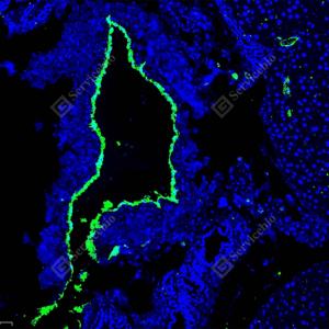| IF检测Von Willebrand Factor蛋白(货号 GB120019)(绿色). 样品: 大鼠睾丸, 4%多聚甲醛 (货号G1101) 固定12-24小时. 抗原修复: 柠檬酸抗原修复液(干粉, pH 6.0) (G1201), 高压锅均匀喷气计时2分钟. 封闭: 3% BSA(货号GC305010)的PBS溶液, 室温孵育30分钟. —抗: 1: 1000稀释, 4℃ 孵育过夜. 二抗: Alexa Fluor 488标记山羊抗小鼠IgG (H+L) (货号GB25301), 1: 400稀释, 室温孵育1小时. |