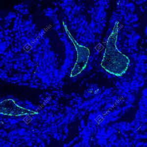 | IF检测Von Willebrand Factor蛋白(货号 GB120019)(绿色). 样品: 人肺腺癌, 4%多聚甲醛 (货号G1101) 固定12-24小时. 抗原修复: 柠檬酸抗原修复液(干粉, pH 6.0) (G1201), 高压锅均匀喷气计时2分钟. 封闭: 3% BSA(货号GC305010)的PBS溶液, 室温孵育30分钟. —抗: 1: 1000稀释, 4℃ 孵育过夜. 二抗: Alexa Fluor 488标记山羊抗小鼠IgG (H+L) (货号GB25301), 1: 400稀释, 室温孵育1小时. |