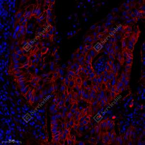 IF检测EPCR/CD201蛋白(货号 GB112210)(红色). 样品: 人肺癌, 4%多聚甲醛 (货号G1101) 固定12-24小时. 抗原修复: Tris-EDTA抗原修复液(pH 9.0) (G1203), 98℃, 20分钟. 封闭: 3% BSA(货号GC305010)的PBS溶液, 室温孵育30分钟. —抗: 1: 600稀释, 4℃ 孵育过夜. 二抗: Cy3标记山羊抗兔IgG (H+L) (货号GB21303), 1: 300稀释, 室温孵育1小时. |