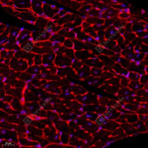 IF检测EPCR/CD201蛋白(货号 GB112210)(红色). 样品: 小鼠心, 4%多聚甲醛 (货号G1101) 固定12-24小时. 抗原修复: Tris-EDTA抗原修复液(pH 9.0) (G1203), 98℃, 20分钟. 封闭: 3% BSA(货号GC305010)的PBS溶液, 室温孵育30分钟. —抗: 1: 600稀释, 4℃ 孵育过夜. 二抗: Cy3标记山羊抗兔IgG (H+L) (货号GB21303), 1: 300稀释, 室温孵育1小时. |
