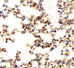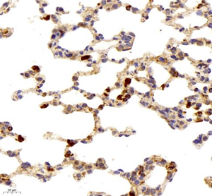 | Immunohistochemistry of paraffin embedded mouse lung using TIE2 (GB11301) at dilution of 1:200 (400x lens) |