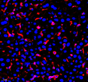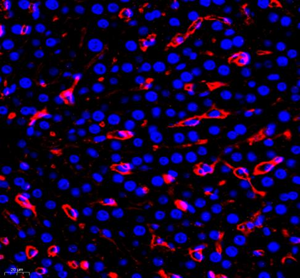 | Immunofluorescence of paraffin embedded mouse liver using TIE2 (GB11301) at dilution of 1:200 (400x lens) |