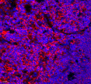Immunofluorescence of paraffin embedded mouse thymus using TIE2 (GB11301) at dilution of 1:200 (400x lens) |