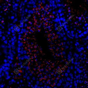 IF检测NANOS2蛋白(货号 GB114466)(红色). 样品: 大鼠睾丸, 4%多聚甲醛 (货号G1101) 固定12-24小时. 抗原修复: Tris-EDTA抗原修复液(pH 9.0) (G1203), 98℃, 20分钟. 封闭: 3% BSA(货号GC305010)的PBS溶液, 室温孵育30分钟. —抗: 1: 600稀释, 4℃ 孵育过夜. 二抗: Cy3标记山羊抗兔IgG (H+L) (货号GB21303), 1: 300稀释, 室温孵育1小时. |