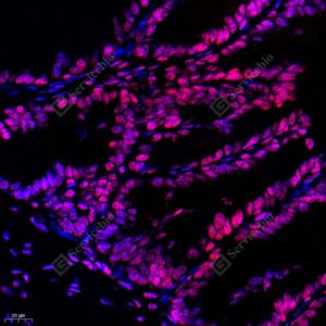 IF检测EMX2蛋白(货号 GB113926)(红色). 样品: 大鼠精囊, 4%多聚甲醛 (货号G1101) 固定12-24小时. 抗原修复: Tris-EDTA抗原修复液(pH 9.0) (G1203), 98℃, 20分钟. 封闭: 3% BSA(货号GC305010)的PBS溶液, 室温孵育30分钟. —抗: 1: 500稀释, 4℃ 孵育过夜. 二抗: Cy3标记山羊抗兔IgG (H+L) (货号GB21303), 1: 300稀释, 室温孵育1小时. |