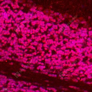 IF检测EMX2蛋白(货号 GB113926)(红色). 样品: 小鼠小脑, 4%多聚甲醛 (货号G1101) 固定12-24小时. 抗原修复: Tris-EDTA抗原修复液(pH 9.0) (G1203), 98℃, 20分钟. 封闭: 3% BSA(货号GC305010)的PBS溶液, 室温孵育30分钟. —抗: 1: 500稀释, 4℃ 孵育过夜. 二抗: Cy3标记山羊抗兔IgG (H+L) (货号GB21303), 1: 300稀释, 室温孵育1小时. |