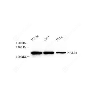 WB检测NALP2蛋白(货号 GB114502). 样品: 经RIPA裂解液(货号G2002)处理的蛋白质. 封闭: 封闭: 3%脱脂牛奶(货号GC310001)溶于TBST溶液, 室温孵育1小时. —抗: 1: 1000稀释, 4℃ 孵育过夜. 二抗: HRP标记山羊抗兔IgG (H+L) (货号GB23303), 1: 5000稀释, 室温孵育1小时. |