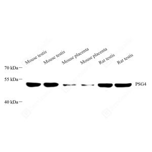 WB检测PSG4蛋白(货号 GB114404). 样品: 经RIPA裂解液(货号G2002)处理的蛋白质. 封闭: 3%脱脂牛奶(货号GC310001)溶于TBST溶液, 室温孵育1小时. —抗: 1: 3000稀释, 4℃ 孵育过夜. 二抗: HRP标记山羊抗兔IgG (H+L) (货号GB23303), 1: 5000稀释, 室温孵育1小时. |