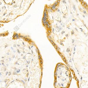 IHC检测PSG4蛋白(货号 GB114404). 样品: 人胎盘, 4%多聚甲醛 (货号G1101) 固定12-24小时. 抗原修复: 柠檬酸抗原修复液(干粉, pH 6.0) (G1201), 98℃, 20分钟. —抗: 1: 2000稀释, 4℃ 孵育过夜. 二抗: HRP标记山羊抗兔IgG (H+L) (货号GB23303), 1: 200稀释, 室温孵育1小时. |