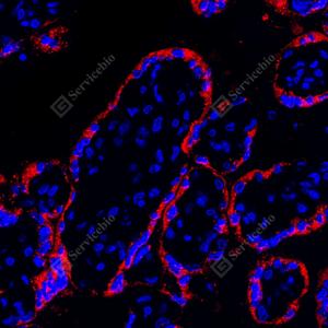 IF检测PSG4蛋白(货号 GB114404)(红色). 样品: 人胎盘, 4%多聚甲醛 (货号G1101) 固定12-24小时. 抗原修复: Tris-EDTA抗原修复液(pH 9.0) (G1203), 98℃, 20分钟. 封闭: 3% BSA(货号GC305010)的PBS溶液, 室温孵育30分钟. —抗: 1: 1000稀释, 4℃ 孵育过夜. 二抗: Cy3标记山羊抗兔IgG (H+L) (货号GB21303), 1: 300稀释, 室温孵育1小时. |