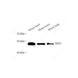 T-box genes encode a family of transcription factors that have been identified in all metazoans and which play diverse roles during embryonic development. TBX5, a member of T-box family, has an essential role in the initiation of limb outgrowth and heart development. Genetic variation near TBX5 that associates with PR and/or QRS interval variation, which suggests that TBX5 plays a role in CCS function in the general population. Because 77 % amino acid sequence of TBX5 is identical to TBX4, this antibody recognizes both TBX4 and TBX5.
