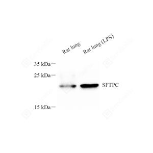 | WB检测Prosurfactant Protein C蛋白(货号 GB114201). 样品: 经RIPA裂解液(货号G2002)处理的蛋白质. 封闭: 3%脱脂牛奶(货号GC310001)溶于TBST溶液, 室温孵育1小时. —抗: 1: 300稀释, 4℃ 孵育过夜. 二抗: HRP标记山羊抗兔IgG (H+L) (货号GB23303), 1: 5000稀释, 室温孵育1小时. |