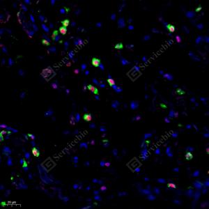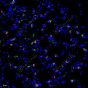 | IF analysis of Prosurfactant Protein C( GB114059)green. Sample: Human lung,, 4% PFA (G1101) 12-24h. Antigen retrieval: Tris-EDTA buffer (pH 9.0) (G1203), 98℃, 20min. Blocking buffer: 3% BSA in PBS (GC305010), RT, 30min. Primary antibody: Prosurfactant Protein C(GB114059) green 1: 1000, 4℃ overnight.488 conjugated Goat Anti-Rabbit IgG (H+L) (GB25303), 1: 400, RT, 1h. TTF1(Thyroid transcription factor 1) (GB122168)red 1: 500, 4℃ overnight.Cy3 conjugated Goat Anti-Mouse IgG (H+L) (GB21301), 1: 300, RT, 1h. |