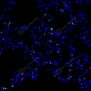| IF analysis of Prosurfactant Protein C( GB114059)green. Sample: Mouse lung,, 4% PFA (G1101) 12-24h. Antigen retrieval:Tris-EDTA buffer (pH 9.0) (G1203), 98℃, 20min. Blocking buffer: 3% BSA in PBS (GC305010), RT, 30min. Primary antibody: Prosurfactant Protein C(GB114059) green 1: 1000, 4℃ overnight.488 conjugated Goat Anti-Rabbit IgG (H+L) (GB25303), 1: 400, RT, 1h. TTF1(Thyroid transcription factor 1) (GB122168)red 1: 500, 4℃ overnight.Cy3 conjugated Goat Anti-Mouse IgG (H+L) (GB21301), 1: 300, RT, 1h. |
