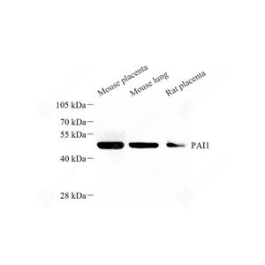WB检测PAI1蛋白(货号 GB115566). 样品: 经RIPA裂解液(货号G2002)处理的蛋白质. 封闭: 封闭: 3%脱脂牛奶(货号GC310001)溶于TBST溶液, 室温孵育1小时. —抗: 1: 300稀释, 4℃ 孵育过夜. 二抗: HRP标记山羊抗兔IgG (H+L) (货号GB23303), 1: 5000稀释, 室温孵育1小时. |