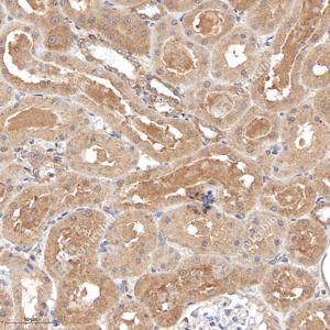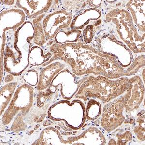 | IHC检测UQCRQ蛋白(货号 GB115003). 样品: 人肾, 4%多聚甲醛 (货号G1101) 固定12-24小时. 抗原修复: Tris-EDTA抗原修复液(pH 9.0) (G1203), 98℃, 20分钟. —抗: 1: 600稀释, 4℃ 孵育过夜. 二抗: HRP标记山羊抗兔IgG (H+L) (货号GB23303), 1: 200稀释, 室温孵育1小时. |