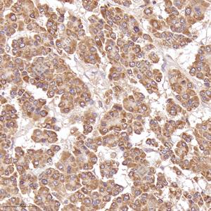 | IHC检测UQCRQ蛋白(货号 GB115003). 样品: 人肝癌, 4%多聚甲醛 (货号G1101) 固定12-24小时. 抗原修复: Tris-EDTA抗原修复液(pH 9.0) (G1203), 98℃, 20分钟. —抗: 1: 600稀释, 4℃ 孵育过夜. 二抗: HRP标记山羊抗兔IgG (H+L) (货号GB23303), 1: 200稀释, 室温孵育1小时. |