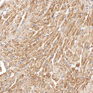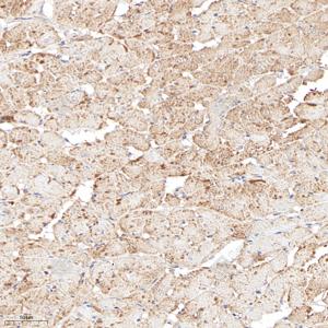 | IHC检测UQCRQ蛋白(货号 GB115003). 样品: 大鼠心, 4%多聚甲醛 (货号G1101) 固定12-24小时. 抗原修复: Tris-EDTA抗原修复液(pH 9.0) (G1203), 98℃, 20分钟. —抗: 1: 600稀释, 4℃ 孵育过夜. 二抗: HRP标记山羊抗兔IgG (H+L) (货号GB23303), 1: 200稀释, 室温孵育1小时. |