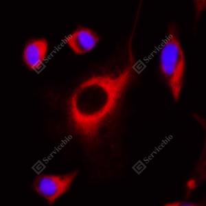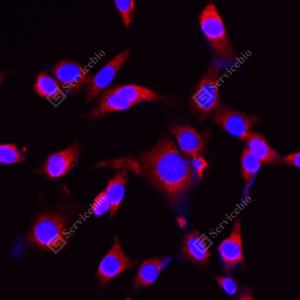 | ICC检测UQCRQ蛋白(货号 GB115003)(红色). 样品: NIH-3T3细胞, 4%多聚甲醛 (货号G1101) 固定20分钟. 封闭: 3% BSA(货号GC305010)的PBS溶液, 室温孵育30分钟. 一抗: 1: 400稀释, 4℃ 孵育过夜. 二抗: Cy3标记山羊抗兔IgG (H+L) (货号GB21303), 1: 300稀释, 室温孵育1小时. |