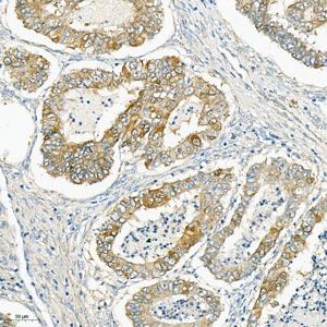 | IHC检测Cathepsin L/MEP蛋白(货号 GB115577). 样品: 人子宫内膜癌, 4%多聚甲醛 (货号G1101) 固定12-24小时. 抗原修复: Tris-EDTA抗原修复液(pH 9.0) (G1203), 98℃, 20分钟. —抗: 1: 150稀释, 4℃ 孵育过夜. 二抗: HRP标记山羊抗兔IgG (H+L) (货号GB23303), 1: 200稀释, 室温孵育1小时. |